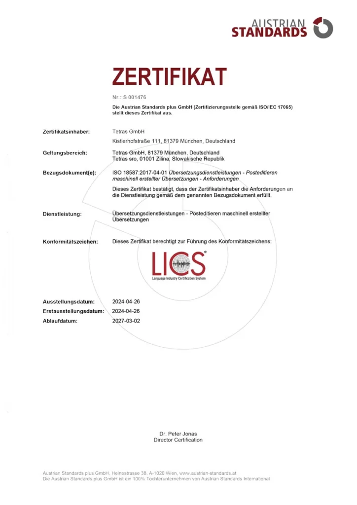 Norma ISO 18587 nás vede k odpovědnému využívání strojových překladů a k jejich optimálnímu spojení s humánními zdroji. Díky tomuto standardu je zajištěno, že jsou cílové texty přesné a konzistentní, a splňují očekávání našich zákazníků po jazykové stránce.